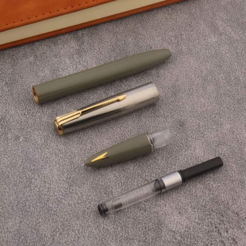 Современная версия cверхпопулярной модели 70–80x годов, Китайская версия Parker 51. Корпус из пластика. Длина в колпачке — 14,1см, без колпачка — 13,7см, толщина — 1,1см. Вес в колпачке — 14гр, без колпачка — 9гр. Перо закрытое F (0,5 мм), сталь с иридиевым наконечником, серебристое. Напротив пера декоративная металлическая стрелка. Заправка поршень. Колпачок серебристые с золотистым клипом.