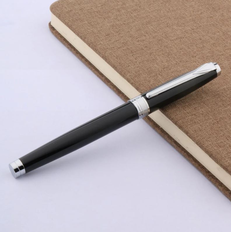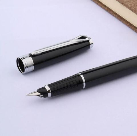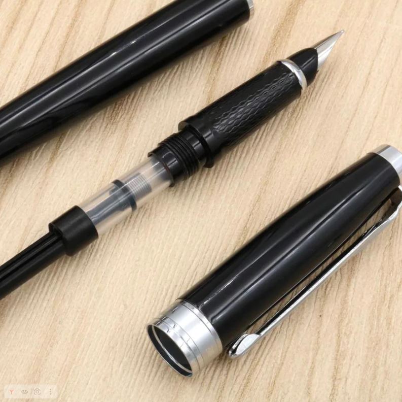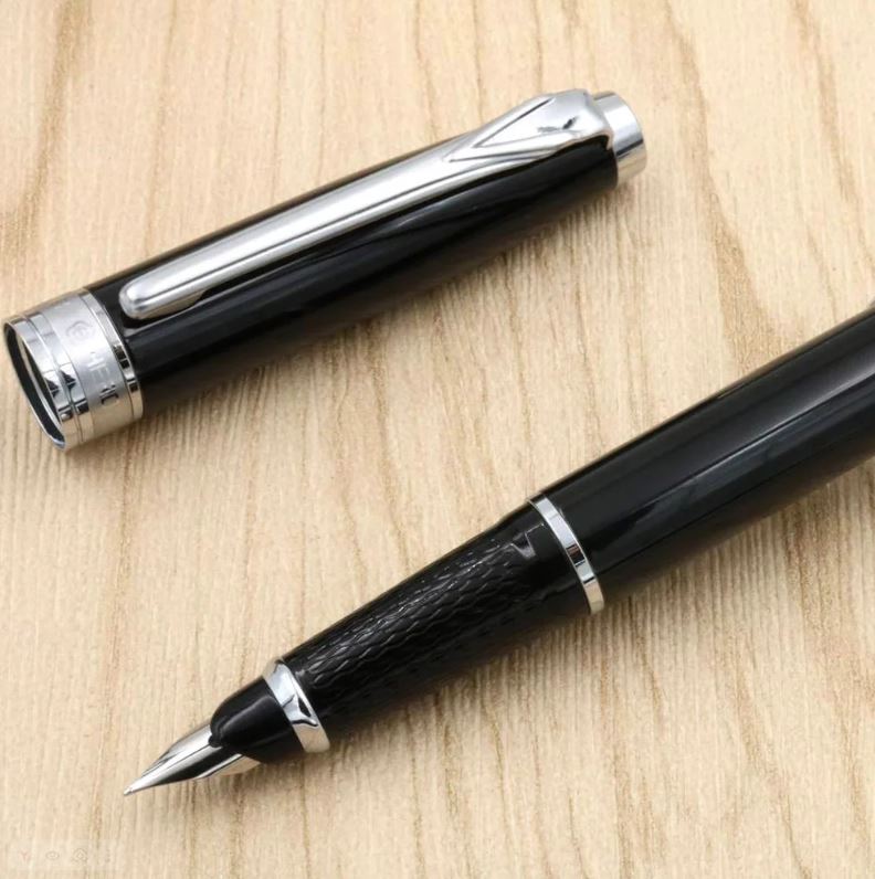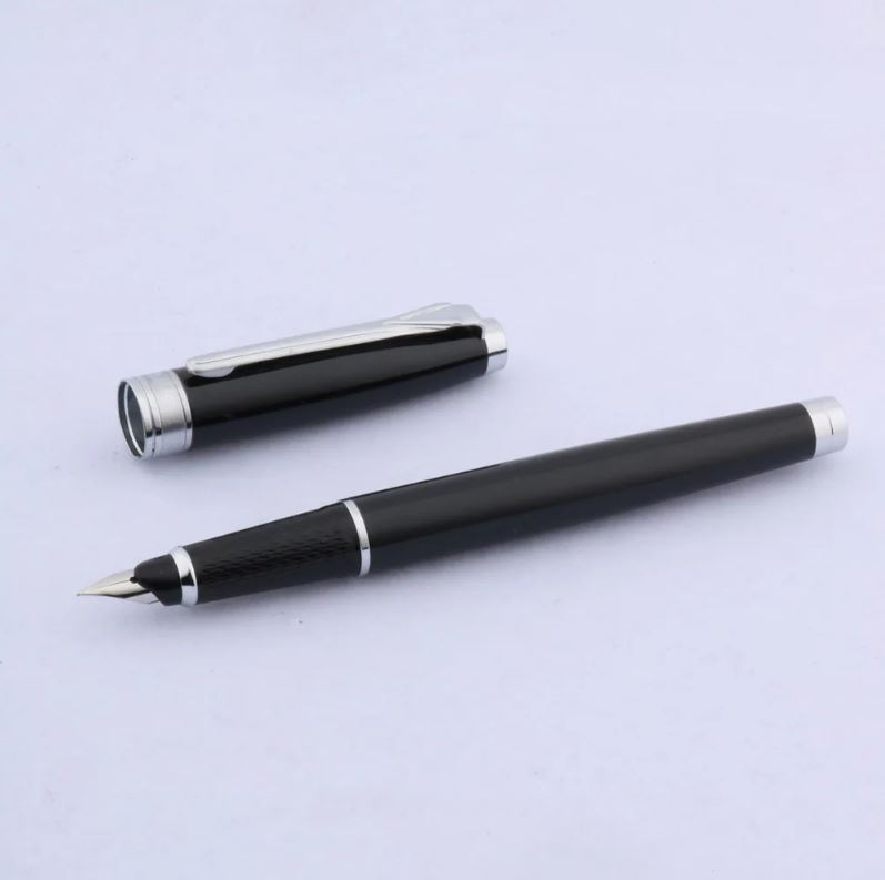 Классическая перьевая ручка в металлическом корпусе, c полуоткрытым пером F (0.5 мм). Заправка поршень. Длина в колпачке ― 13,3 см, длина без колпачка ― 12,5, толщина ― 1см, толщина грип секции 8мм. Вес в колпачке ― 25,5 гр, без колпачка ― 16гр