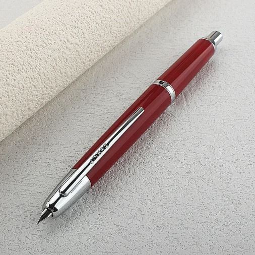 Перьевая ручка в акриловом корпусе, производство Китай. Перо открытое, EF (толщина линии 0,4 мм), стальное, выдвигается нажатием на кнопочку корпуса (как у механического карандаша). Система заправки ― съемный поршень, при желании можно пользоваться картриджами. Длина ручки 14 см. Толщина ― 1,2 см. Вес -19,3 г.