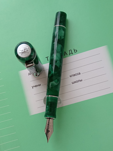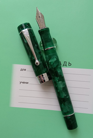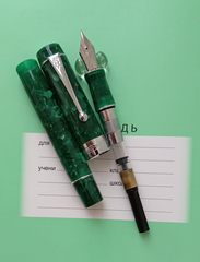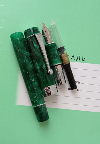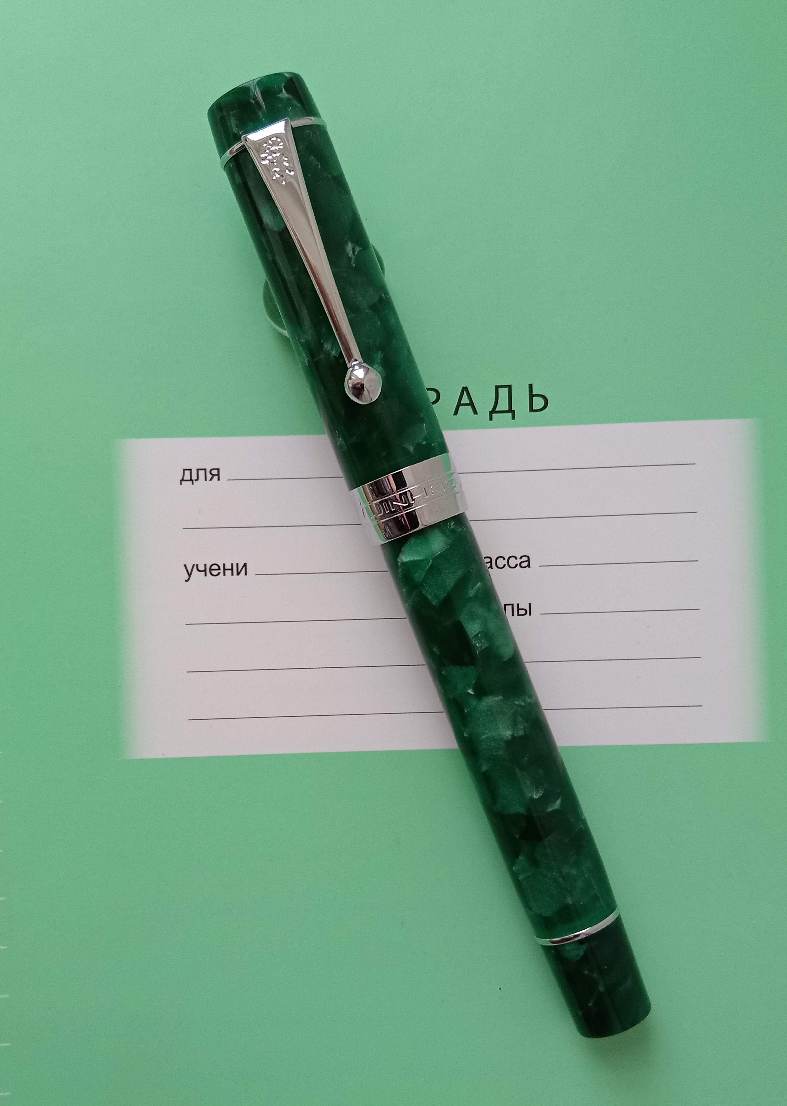 Толстая перьевая ручка из акрила. Открытое перо F (0,6 мм) из стали. Колпачок закручивается. Длина ручки в колпачке 13,8 см, длина без колпачка 12,8 см, длина в открытом виде с надетым сзади колпачком - 17,5 см. Толщина в самом толстом месте 1,1 см, толщина грип секции 1 см. Вес в колпачке 25,7 г, вес без колпачка ― 14 г. Система заправки ― съемный поршень (можно также заправлять картриджами).