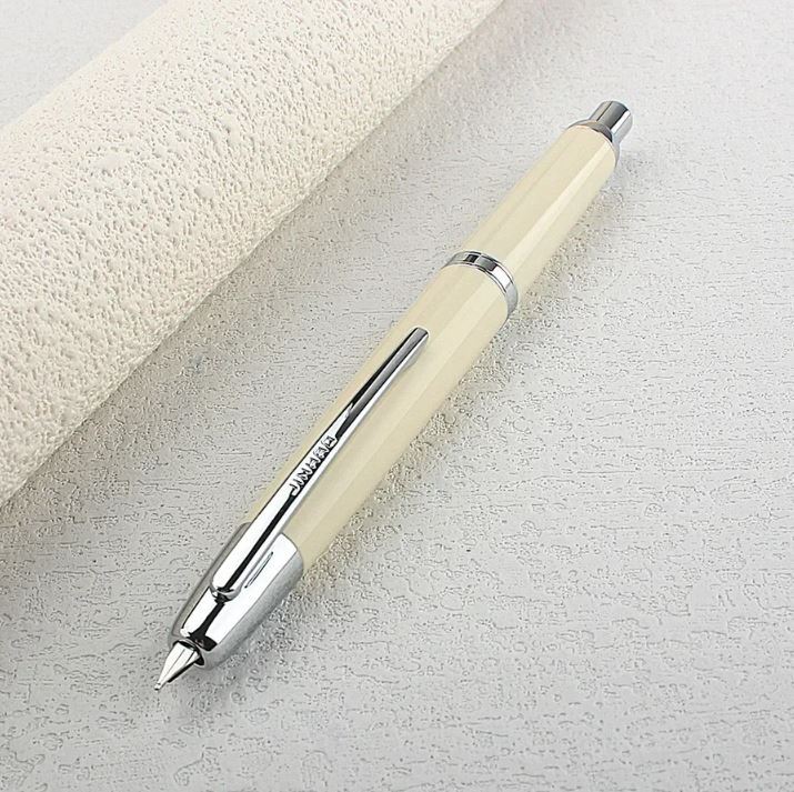 Перьевая ручка в акриловом корпусе, производство Китай. Перо открытое, EF (толщина линии 0,4 мм), стальное, выдвигается нажатием на кнопочку корпуса (как у механического карандаша). Система заправки ― съемный поршень, при желании можно пользоваться картриджами. Длина ручки 14 см. Толщина ― 1,2 см. Вес -19,3 г.
