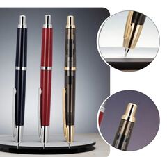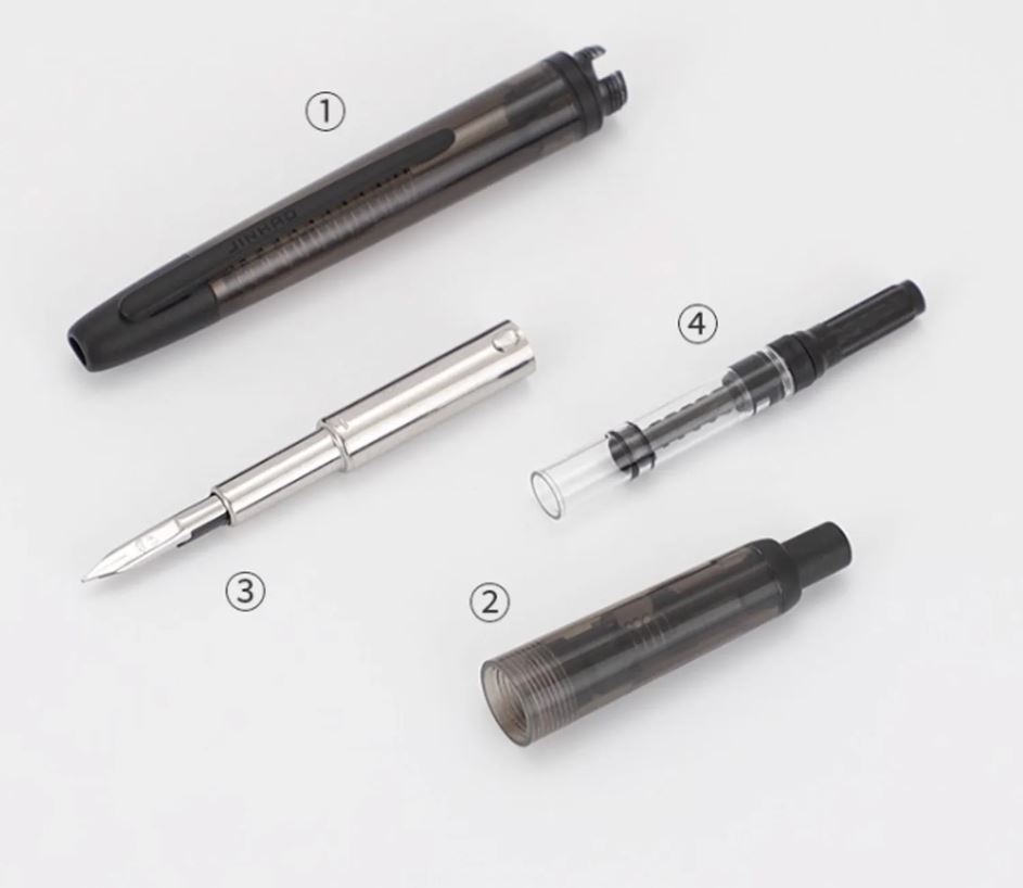 Перьевая ручка в акриловом корпусе, производство Китай. Перо открытое, EF (толщина линии 0,4 мм), стальное, выдвигается нажатием на кнопочку корпуса (как у механического карандаша). Система заправки ― съемный поршень, при желании можно пользоваться картриджами. Длина ручки 14 см. Толщина ― 1,2 см. Вес -19,3 г.