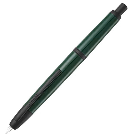 Перьевая ручка в акриловом корпусе, производство Китай. Перо открытое, EF (толщина линии 0,6 мм), стальное, выдвигается нажатием на кнопочку корпуса (как у механического карандаша). Система заправки ― съемный поршень, при желании можно пользоваться картриджами. Длина ручки 14 см. Толщина ― 1,2 см. Вес -19,3 г.