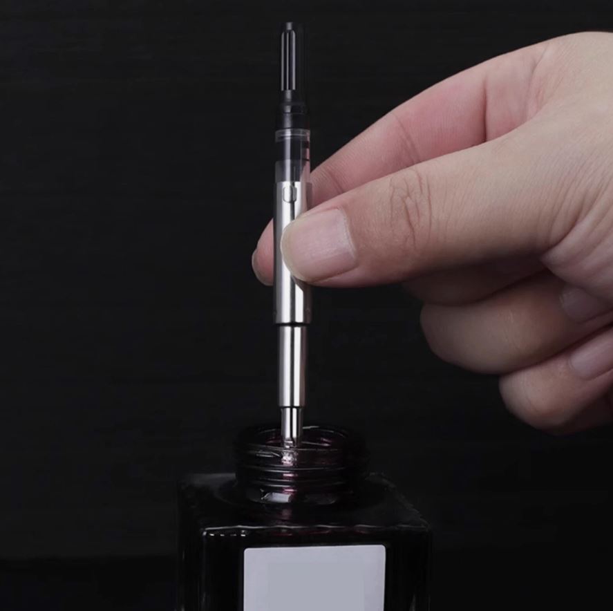 Перьевая ручка в акриловом корпусе, производство Китай. Перо открытое, EF (толщина линии 0,4 мм), стальное, выдвигается нажатием на кнопочку корпуса (как у механического карандаша). Система заправки ― съемный поршень, при желании можно пользоваться картриджами. Длина ручки 14 см. Толщина ― 1,2 см. Вес -19,3 г.