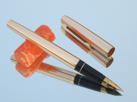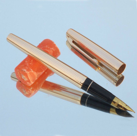 Перьевая ручка Wing Sung 235, винтаж, производство Китай 1970-1990-е годы. Открытое перо F(0.5 мм) из стали с иридиевым наконечником. Золотистый металлический корпус с насечкой в клетку. Заправка пипеткой. Ручка очень легкая ― вес в колпачке 14 гр , без колпачка ― 6 гр. Длина в колпачке 14,3 см , без колпачка ― 13 см.